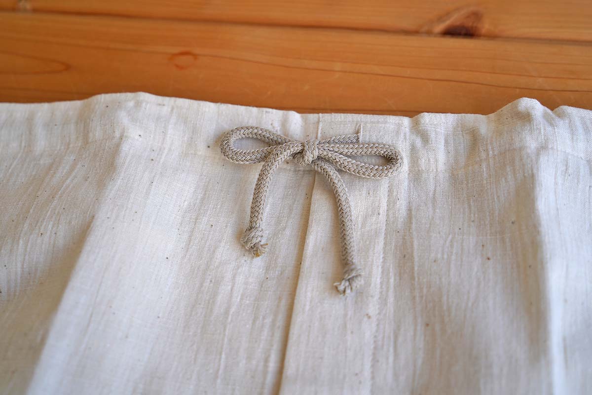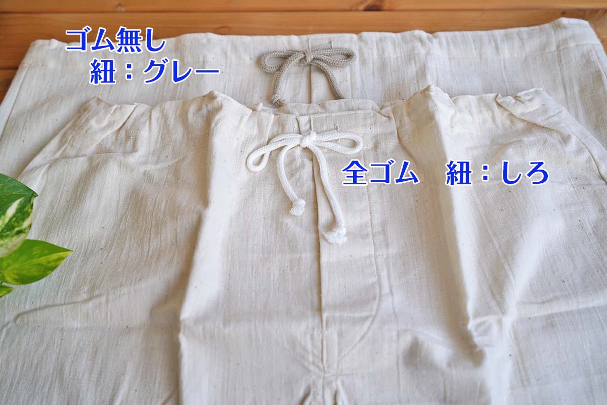 生地は、藍染めストライプと同じくシャキっと感があります。紐の色は、全ゴムとゴム無しで異なります。