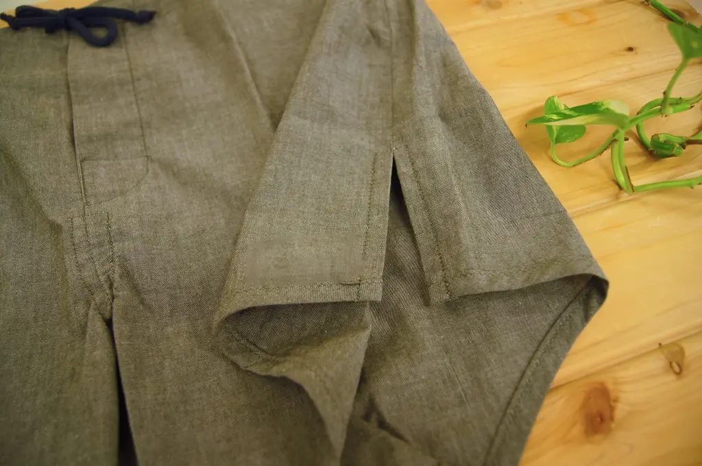 フロント部分は、面倒なボタンは外し、合わせを深く取りました。男性には、嬉しい安心感! 大抵のトランクスは、あわせ部分が半分しかないみたいです。生地を全面あわせることで、しっかりと閉じてくれます。