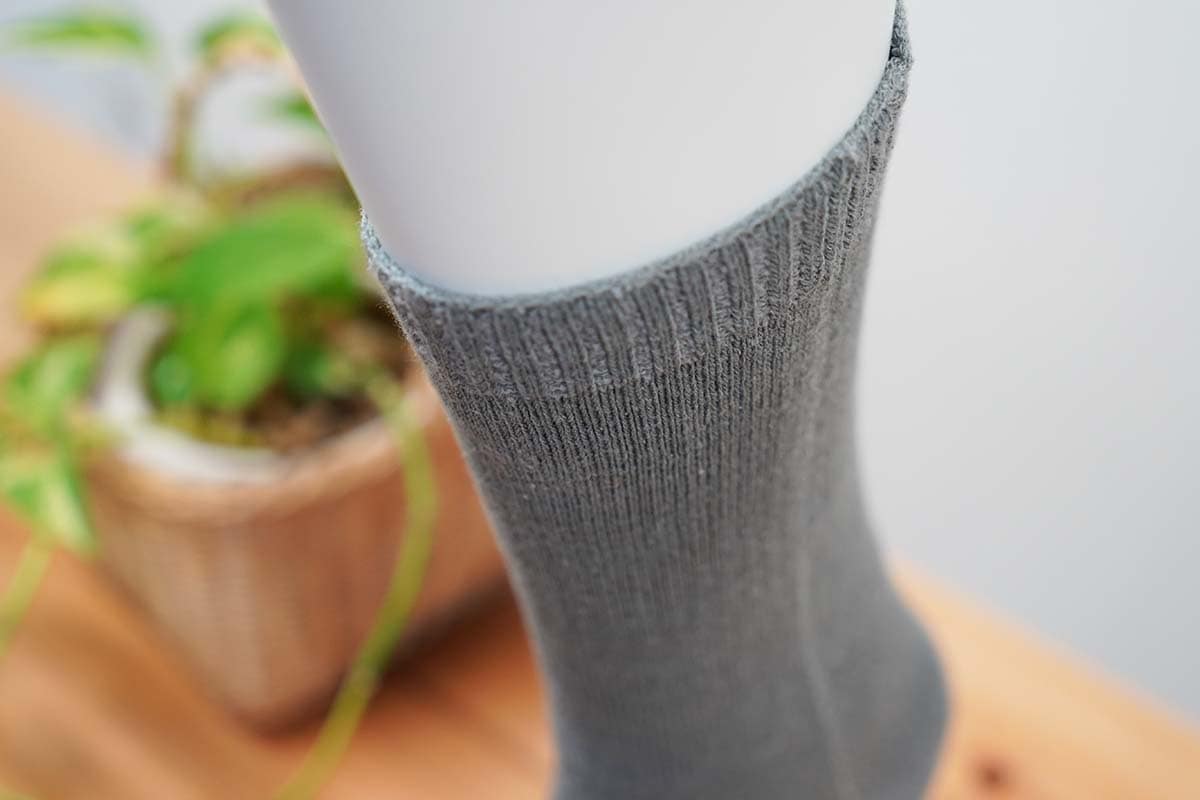 口ゴム部分は、折り返しのない『ゆったり』タイプ。締付けが無く、編み上げの工夫によりズレを防いでいます。 不快な締付けが無く、締付け後がほとんど付きません。 写真は「杢(もく)調グレー」です。 実際に(ふくらはぎがかなり太い)店主が履いてみても、工夫された口ゴム部分のお陰で締付け後は全く残りませんでした。太さに依存すると思いますが、伸縮性に優れていることも快適な理由でしょう。