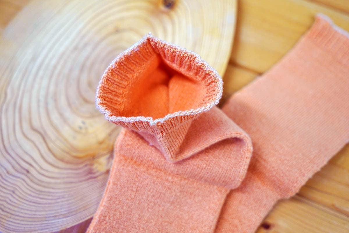 口ゴム部分は、折り返しのない『ゆったり』タイプ。締付けが無く、編み上げの工夫によりズレを防いでいます。 不快な締付けが無く、締付け後がほとんど付きません。 写真は「アプリコット」です。 実際に(ふくらはぎがかなり太い)店主が履いてみても、工夫された口ゴム部分のお陰で締付け後は全く残りませんでした。太さに依存すると思いますが、伸縮性に優れていることも快適な理由でしょう。