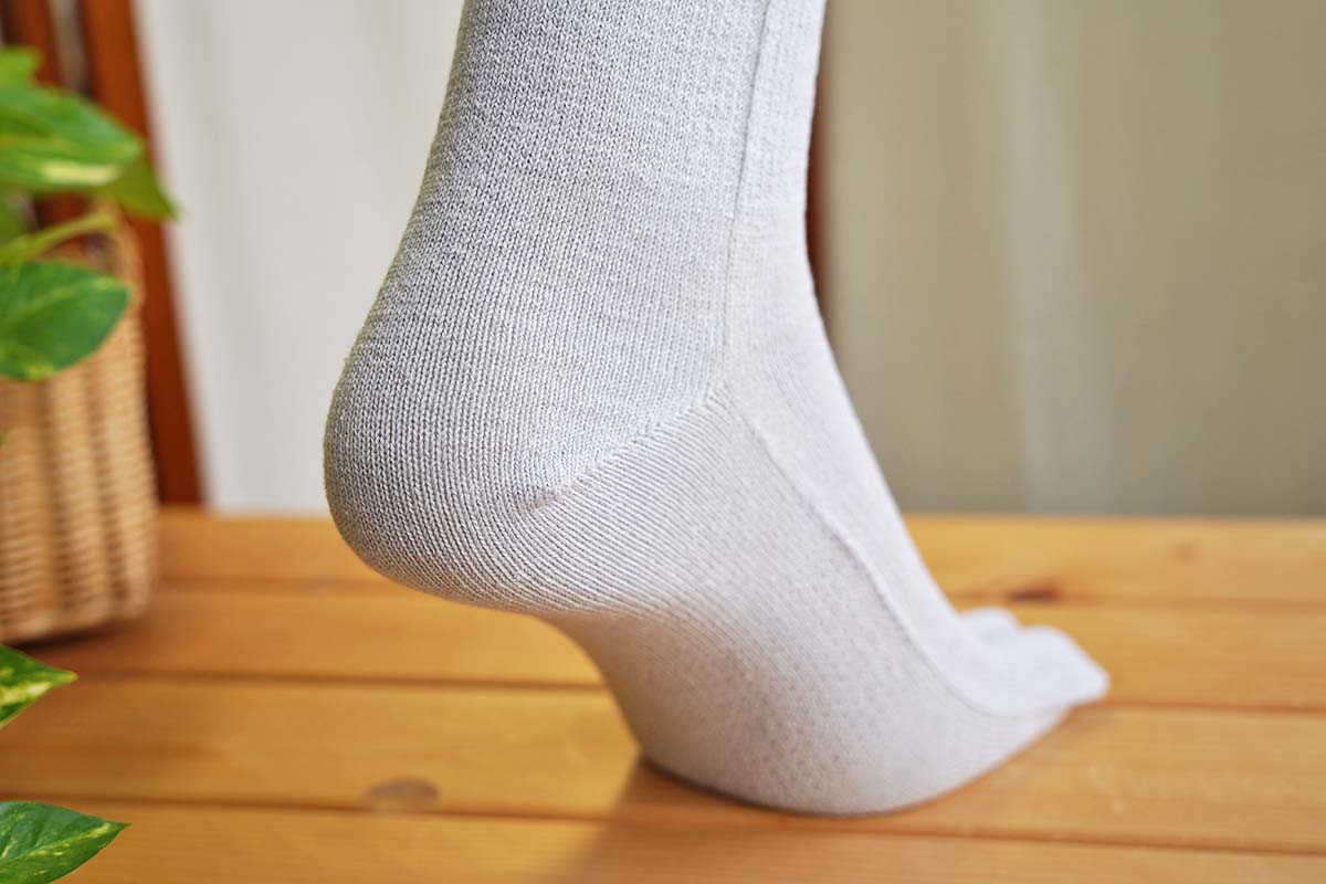 口ゴム部分は、折り返しのない『ゆったり』タイプ。締付けが無く、編み上げの工夫によりズレを防いでいます。 不快な締付けが無く、締付け後がほとんど付きません。 実際に(ふくらはぎがかなり太い)店主が履いてみても、工夫された口ゴム部分のお陰で締付け後は全く残りませんでした。太さに依存すると思いますが、伸縮性に優れていることも快適な理由でしょう。