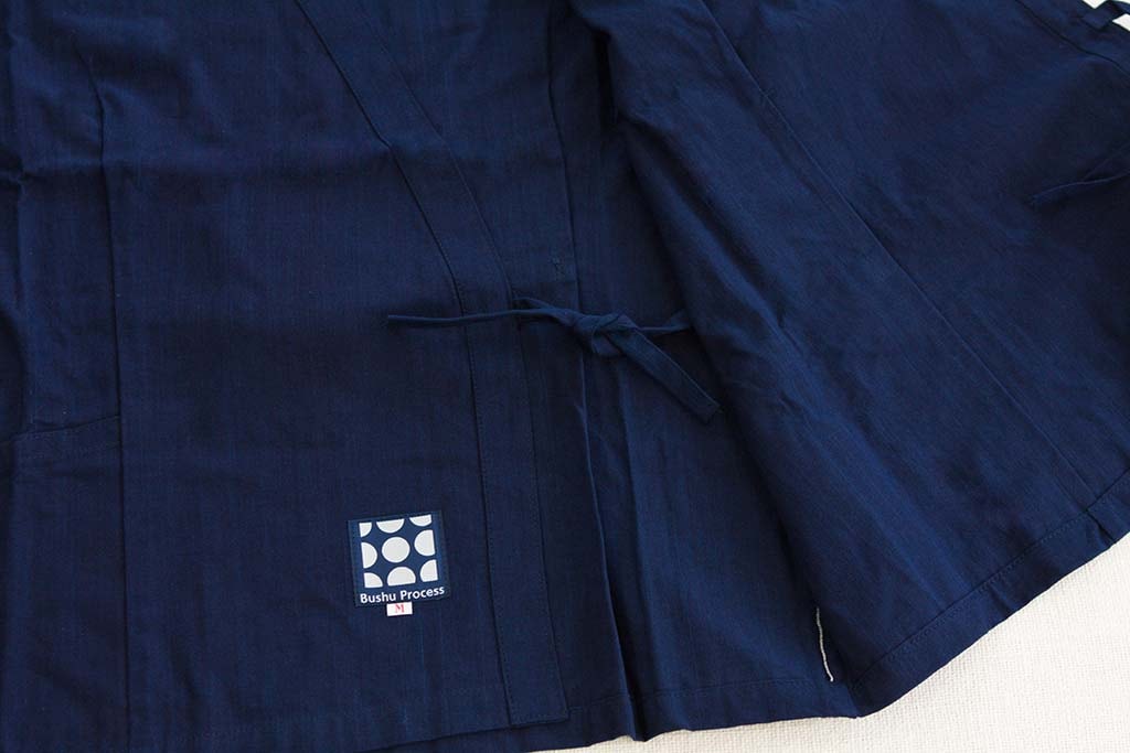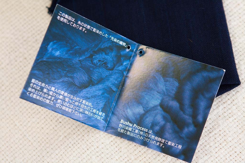 天然の藍染めを糸から行い、反にしてから裁断しております。同じ反でも生地を取る場所によっては多少異なる色になっていることがあります。ご了承のほどお買い求めください。
