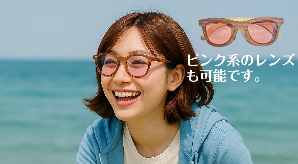 『アクセグラス Woodyシリーズ』、アクセサリーとしてのカラーグラスです。日本製のUV400グラスを採用しているため、強い陽射しからも目を守ります。